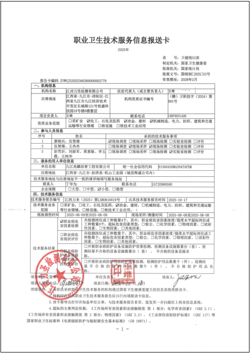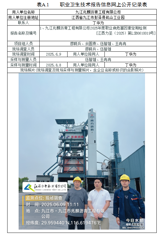 九江兆麟沥青工程有限公司 2025年度职业病危害因素定期检测
