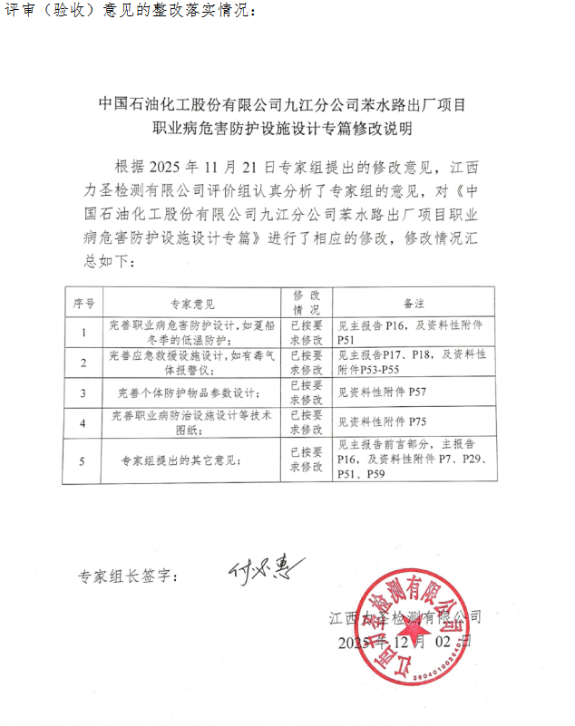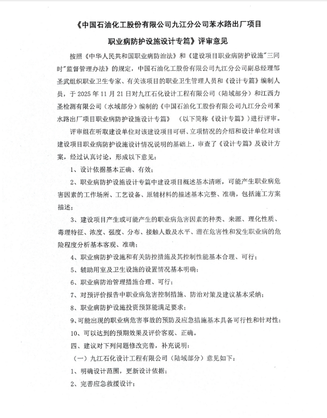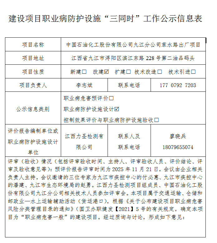 中国石油化工股份有限公司九江分公司苯水路出厂项目职业病防护设施设计专篇