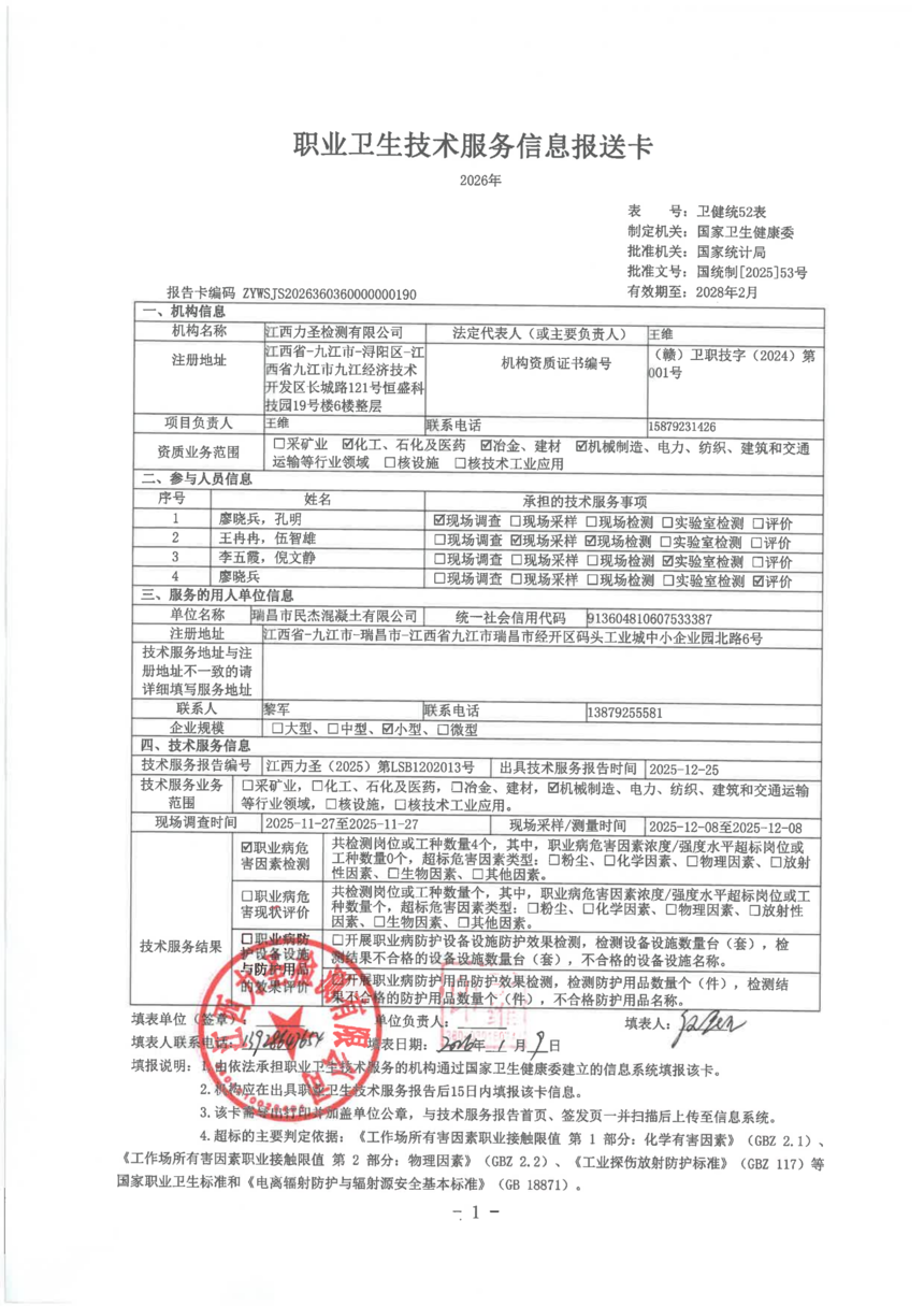 瑞昌市民杰混凝土职业病危害因素2025年定期检测项目