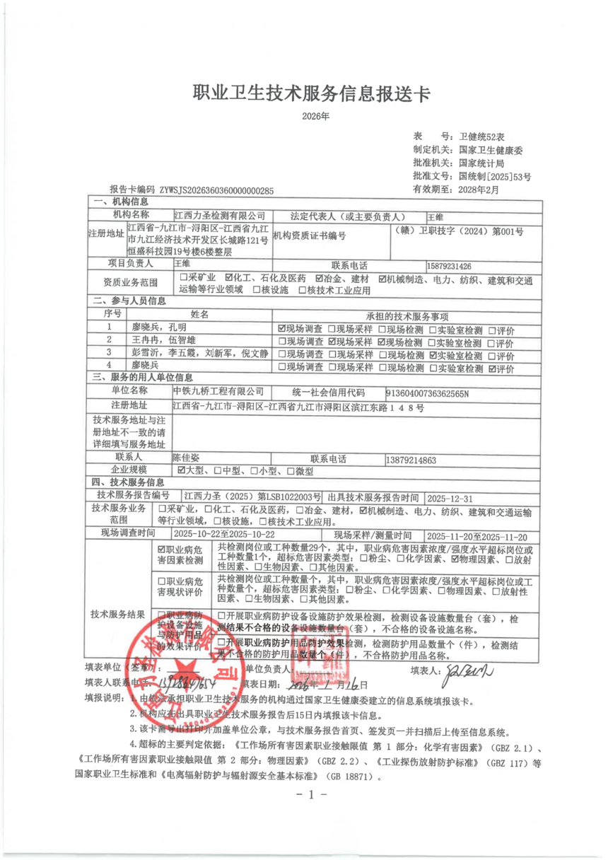 中铁九桥工程有限公司职业病危害因素2025年定期检测项目
