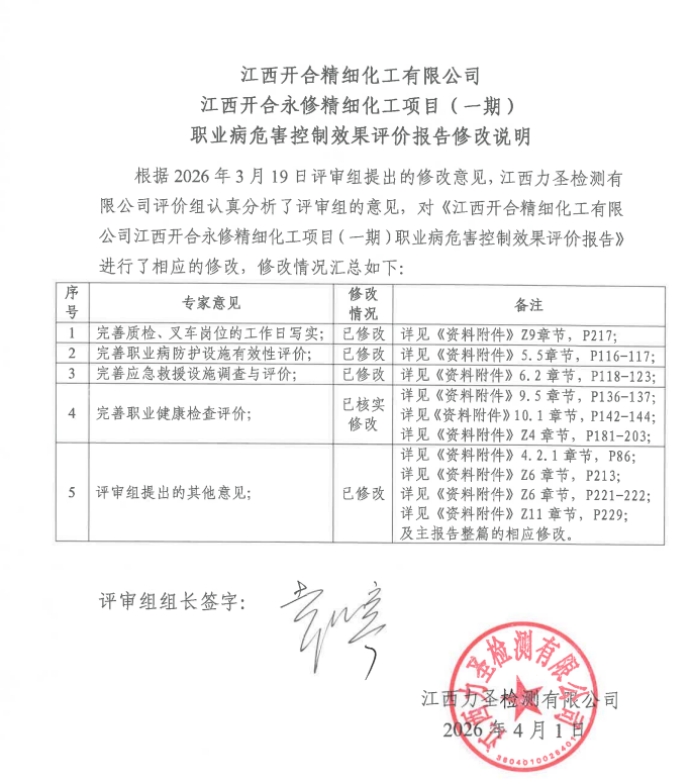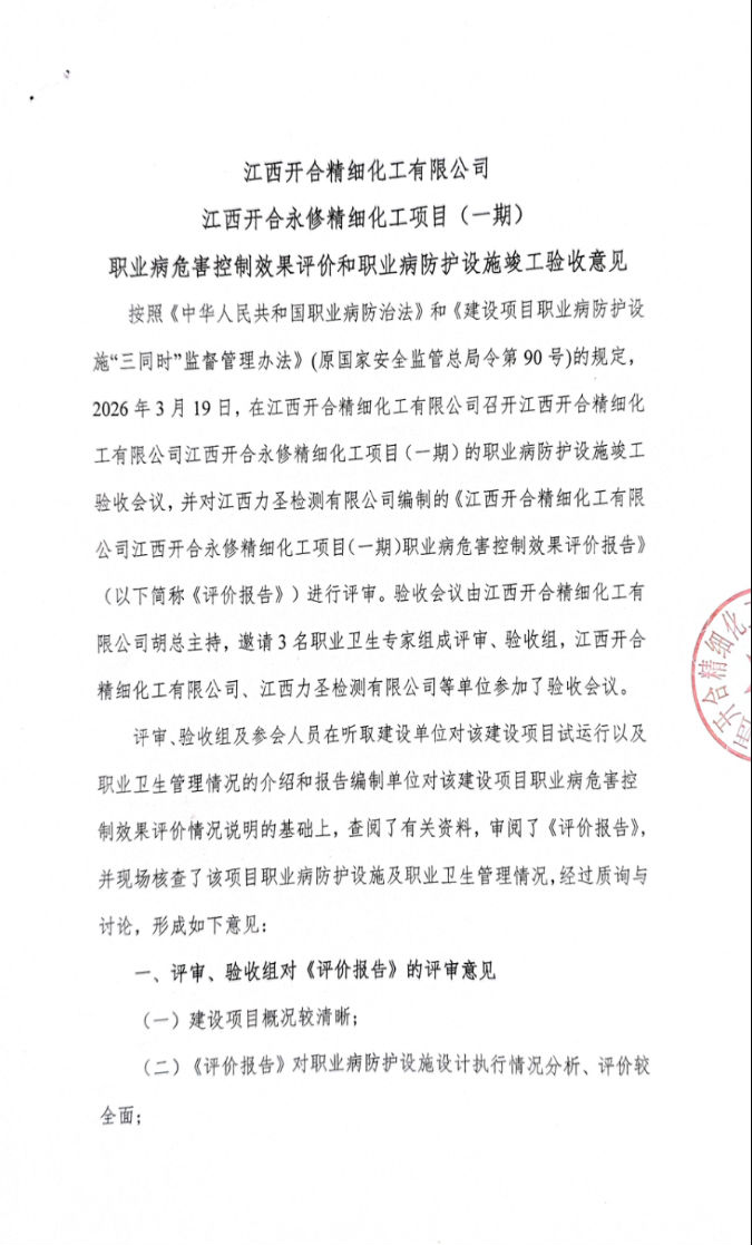 江西开合精细化工有限公司江西开合永修精细化工项目(一期)职业病危害控制效果评价报告表A.1 职业卫生技术报告信息网上公开记录表